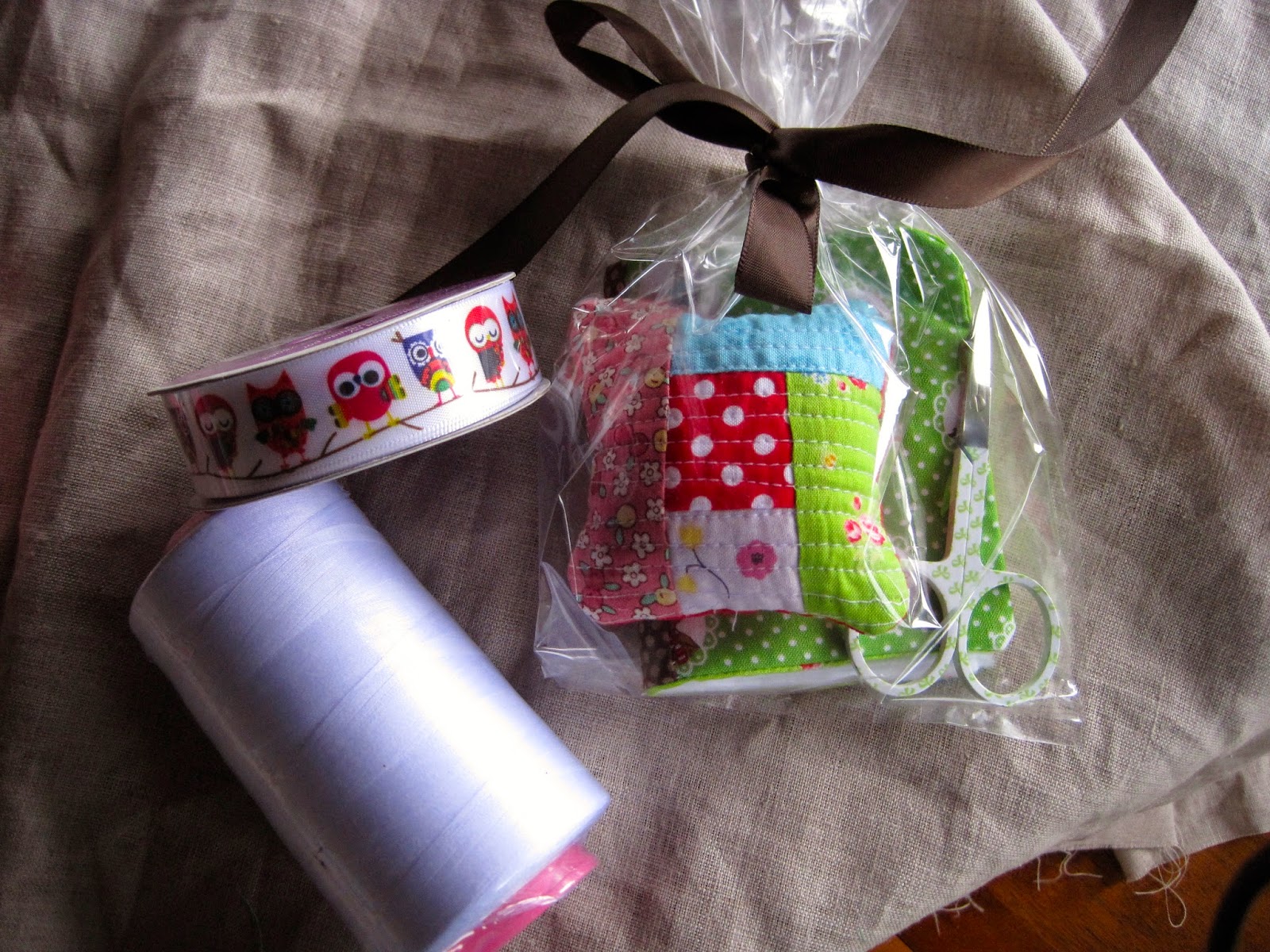 Oh how I love giving handmade. Crafting something with someone specific in mind. Putting love and thought into items for loved ones. It is my good friend's birthday tomorrow and I put together a sewing basket for her. The basket is actually this tutorial, the needle book from this tutorial, and the pin cushion a block that I started for the log cabin quilt along that I never got around to finishing. Along with the handmade items were some thread, owl ribbon, and a pair of embroidery scissors. Some chocolate may have snuck into the basket last minute as well. All of these items are things in my own sewing basket that follows me around the house - that carries me from project to project.